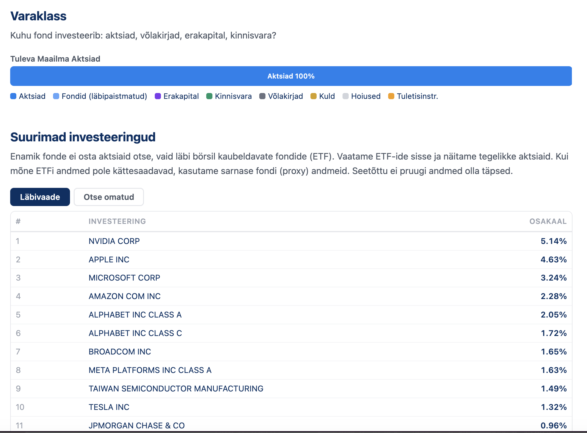 Aga see tähendab ka seda, et kui ühe pensionifondi raportis näed rida “iShares Core MSCI World” ja teises “SPDR MSCI World ETF”, ei välista see, et mõlemad fondid investeerivad tegelikult sinu vara samadesse, maailma suurimate börsiettevõtete aktsiatesse. Kui tahad päriselt aru saada, kuhu su raha on investeeritud (näiteks selleks, et kontrollida müügimehe väidet, et nende fondis oled sa USA tehnoloogiaktsiate riski vastu kaitstud), on vaja ka alusfondide andmeid. Need asuvad sageli mujal, teises formaadis ja vahel ainult tasu eest.