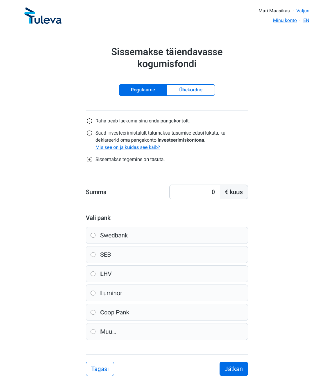 Aga demo läheb just nii, nagu peab. Igaüks saab Tuleva lehel sisse logides kanda euro või paar meie fondi mängukontole ja mõne aja pärast ilmuvad osakud „automaagiliselt” päris kontole. Ja need, kelle makse oli vigane, saavad automaatselt raha tagasi. Töötab!