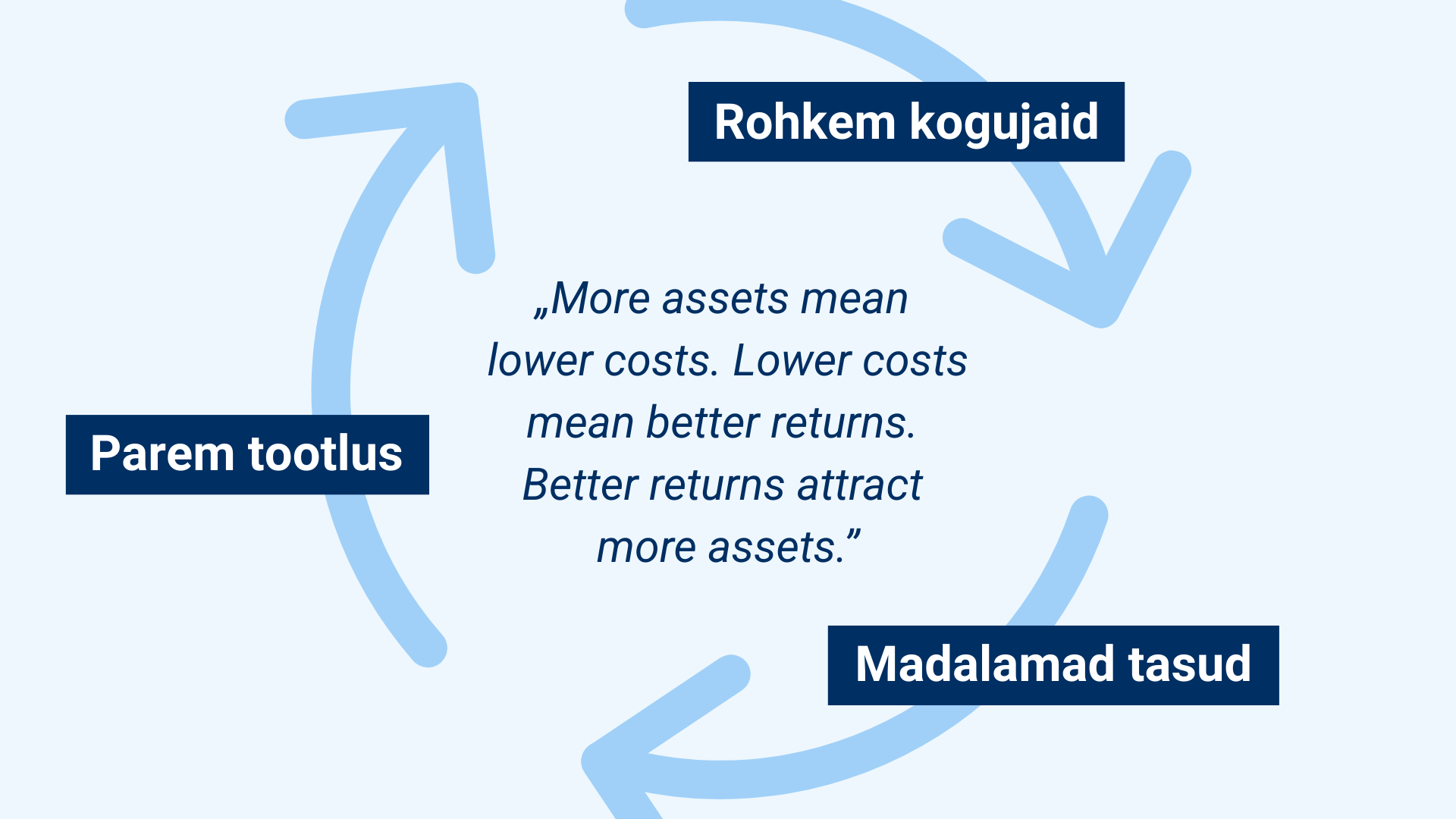 Investeerimine on mahupõhine äri ning mida suuremaks kasvab meie hallatav vara, seda väiksemad on kulud ühe koguja kohta. Iga uus euro, mis Tuleva fondidesse lisandub, aitab vähendada tasusid kõigi jaoks. See toob omakorda Tulevasse uusi kogujaid. See ongi meie ärimudel.