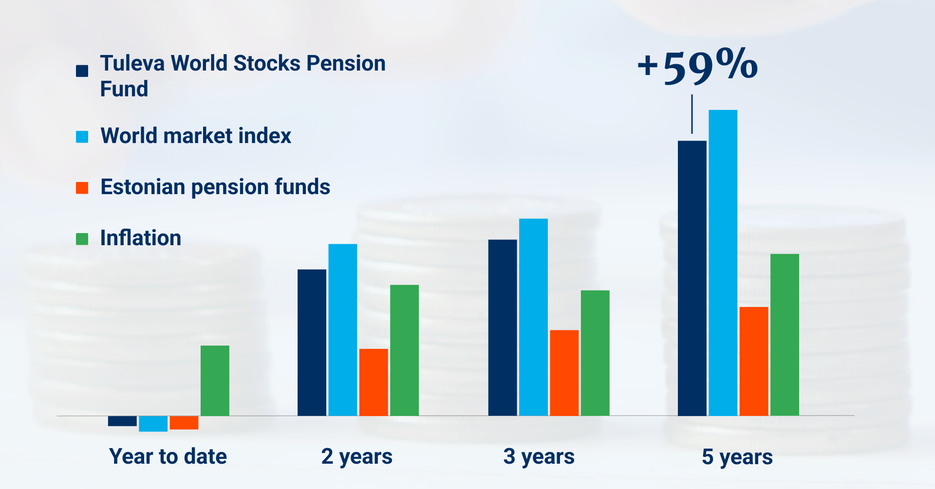 This year, we also added inflation to the comparison, which has increased consumer prices by nearly 15% since the beginning of the year (from January to July), according to Statistics Estonia (annual inflation exceeded 20% at the end of July). In the past five years, inflation has reduced the value of money by an average of nearly 6% per annum. By the way, Tuleva investors can compare the performance of their pension account with both the world market average and inflation – log in and click on “World market return” in the “Your personal rate of return” drop-down menu and select “Inflation”.